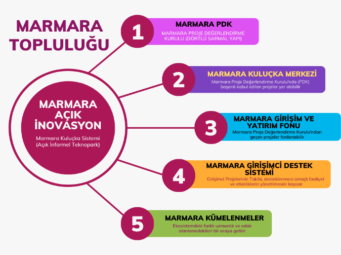 The Marmara Community serves as the overarching organization that houses the Marmara Open Innovation System and its various subgroups. Its primary goal is to establish an open, informal technopark that facilitates collaboration and innovation among its members.